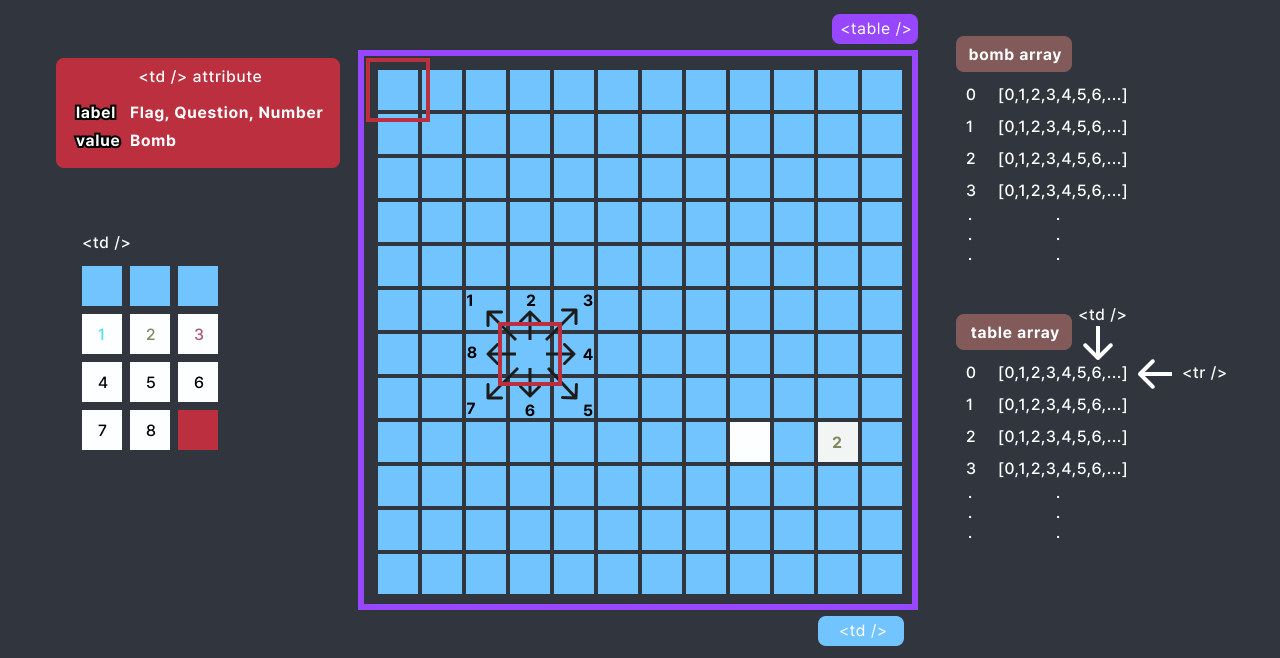 - 게임 시작 시, 지뢰를 랜덤으로 계산하여 bomb array에 저장, table의 value에 업데이트